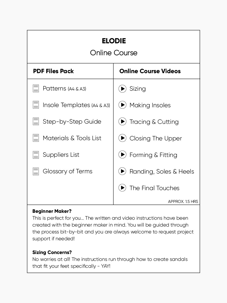This online course will guide you through all of the steps required to make your own pair of Elodie Sandals!